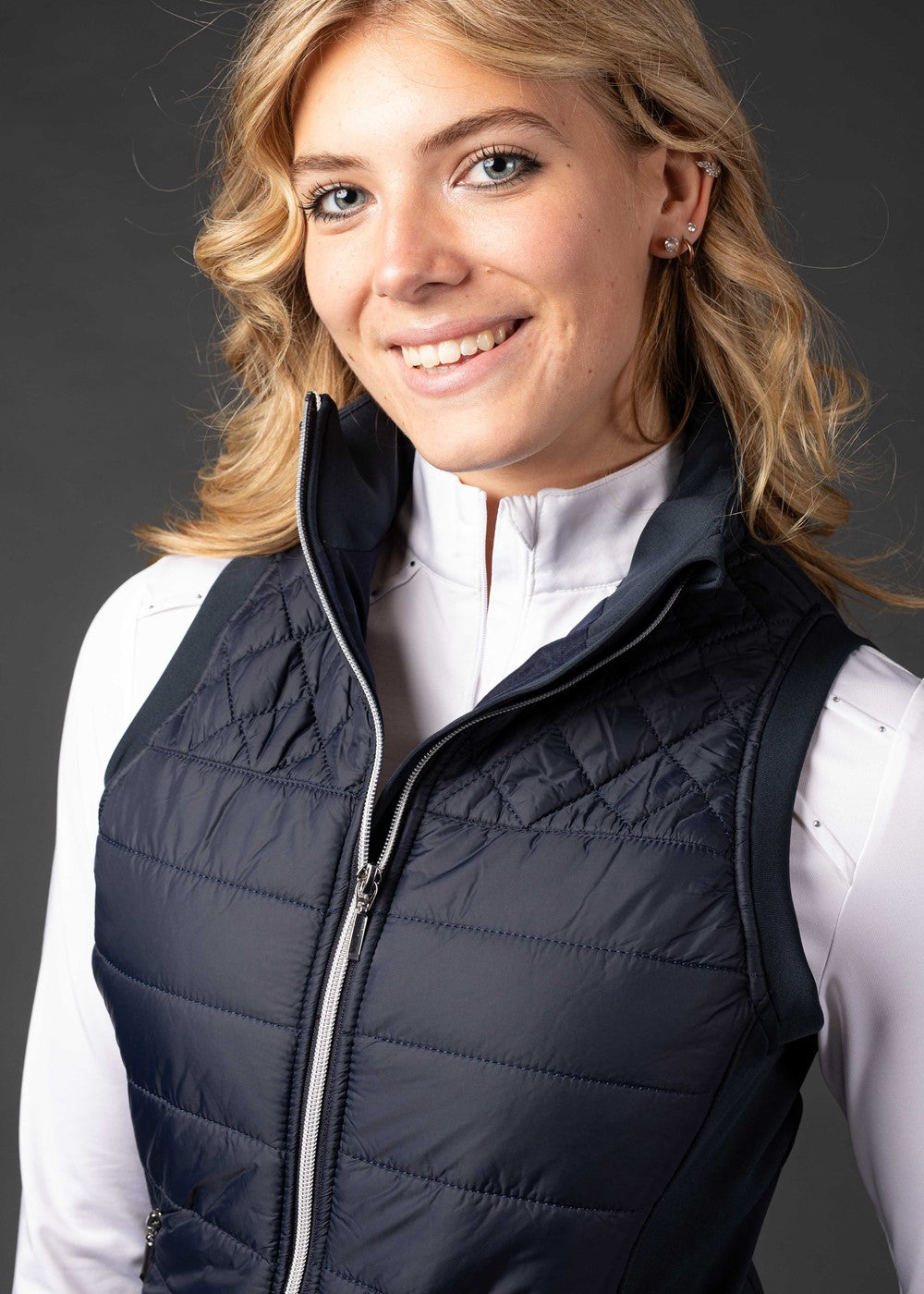 Sportieve bodywarmer met gevoerde body en comfortabele stretch zijpanelen, een tweeweg ritssluiting en twee steekzakken met ritssluiting.