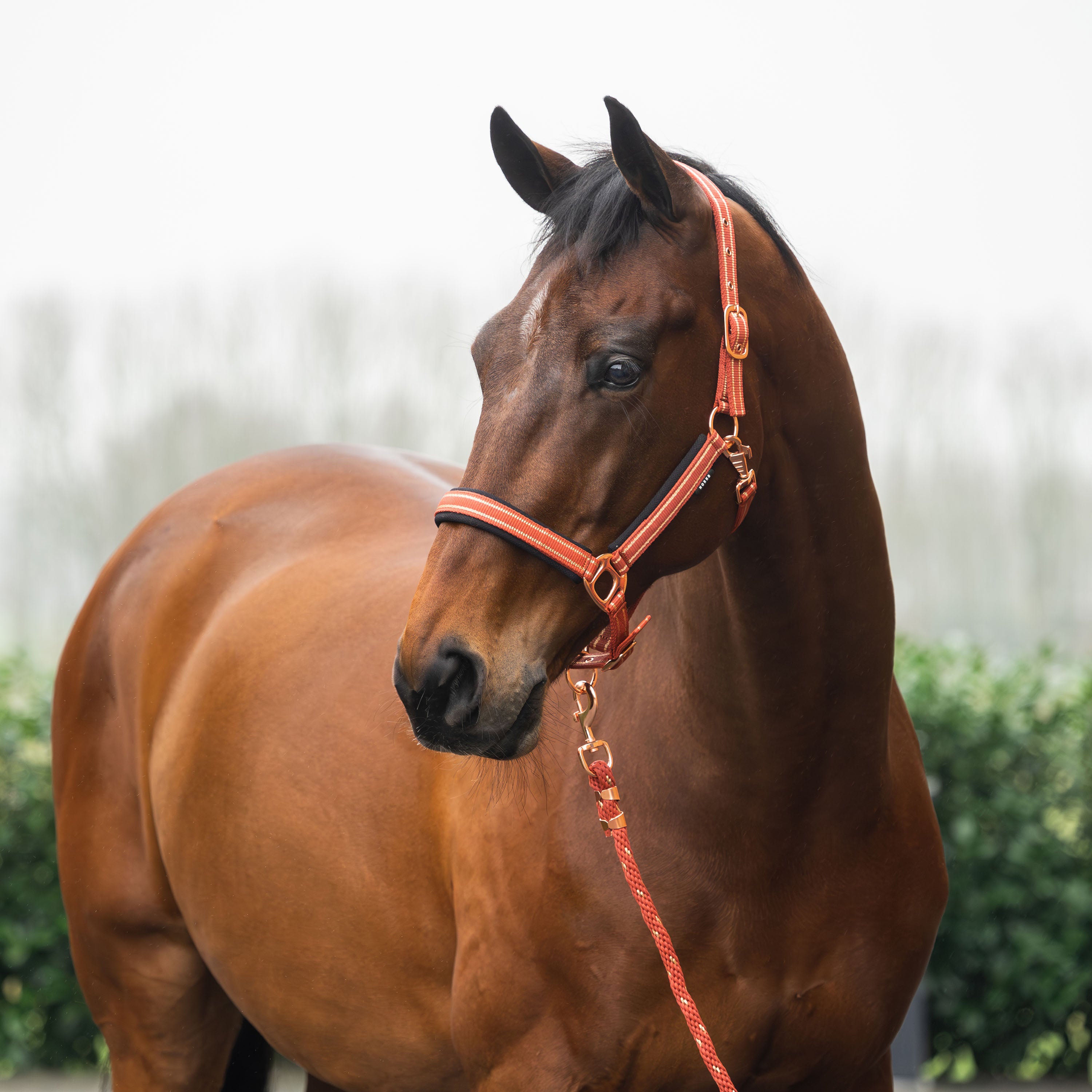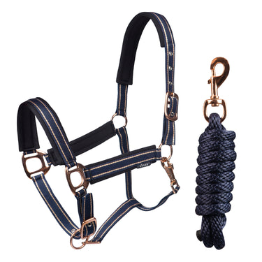 Luxuriöses zweifarbiges Halfterset, verstellbar an Genickstück und Nasenriemen, inklusive 200 cm Führstrick mit Karabinerhaken. Das Halfter ist an Genickstück, Nasenriemen und Backenstücken mit Mesh-Polsterung gefüttert und in Silber oder Roségold gehalten. Produktspezifikationen: Halfter inklusive 200 cm Führstrick mit Karabinerhaken Genickstück, Nasenriemen und Backenstücke mit Mesh-Polsterung Genickstück und Nasenriemen verstellbar Schwarz mit silbernen Drahtschnallen und Beschlägen Blau mit roségoldenen Drahtschnallen und Beschlägen Material: PP-Nylon und Polyester