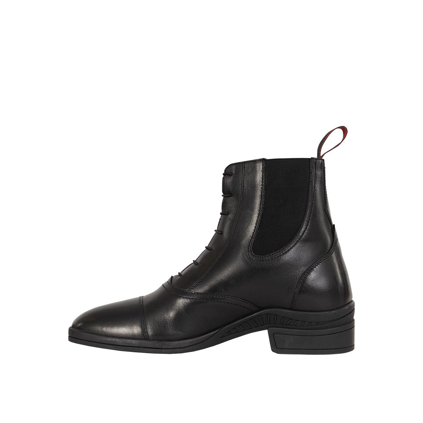 An der Außenseite ist der Jodhpur mit einem robusten YKK-Reißverschluss ausgestattet. Die elastische Schnürung und die elastischen Einsätze sorgen zusammen für eine angenehme, eng anliegende Passform, bei der die Knöchel schön betont werden. Die Gummi-Außensohle mit Anti-Rutsch-Muster sorgt für einen stabilen und sicheren Halt. Die Schlaufe an der Rückseite erleichtert das Anziehen des Jodhpurs noch etwas.