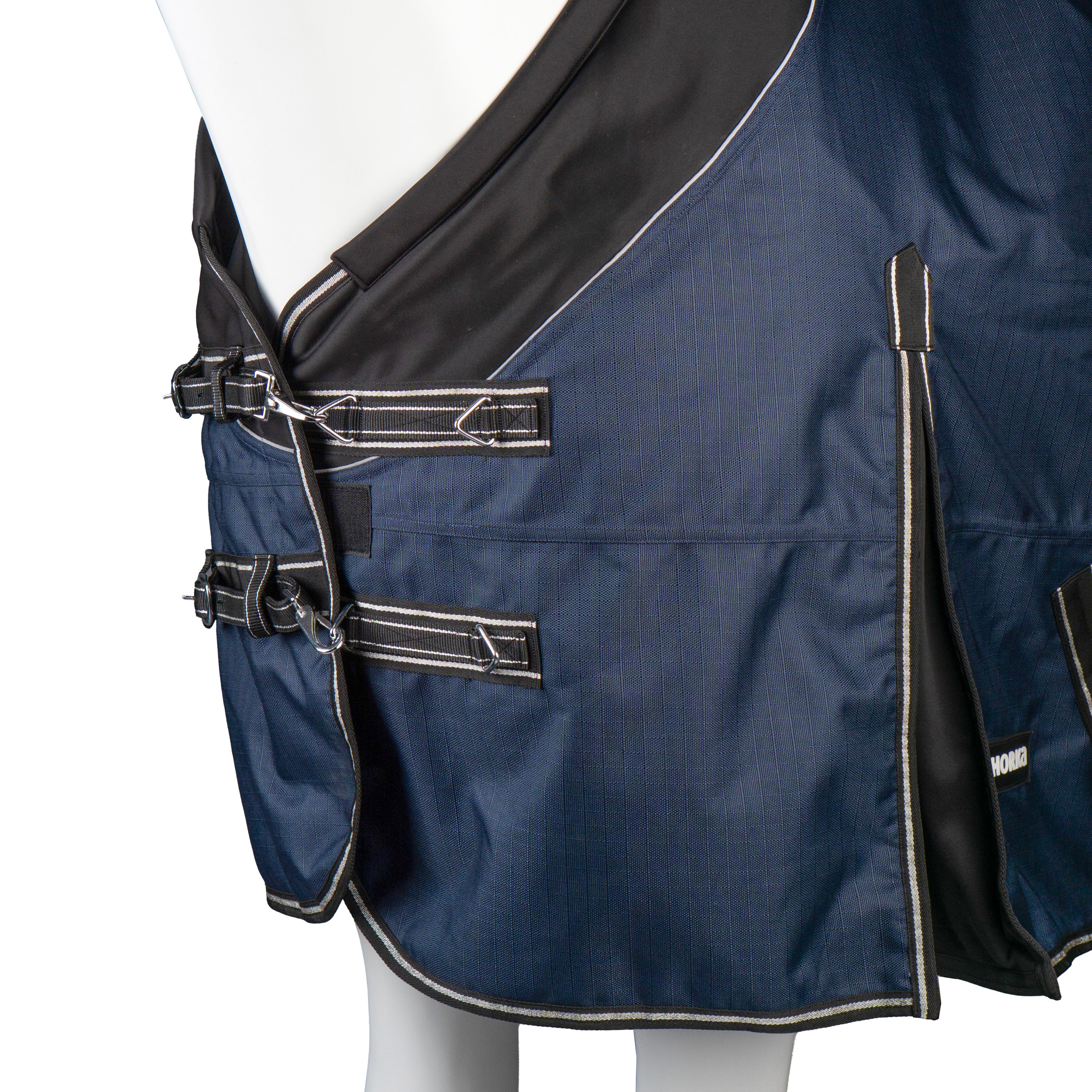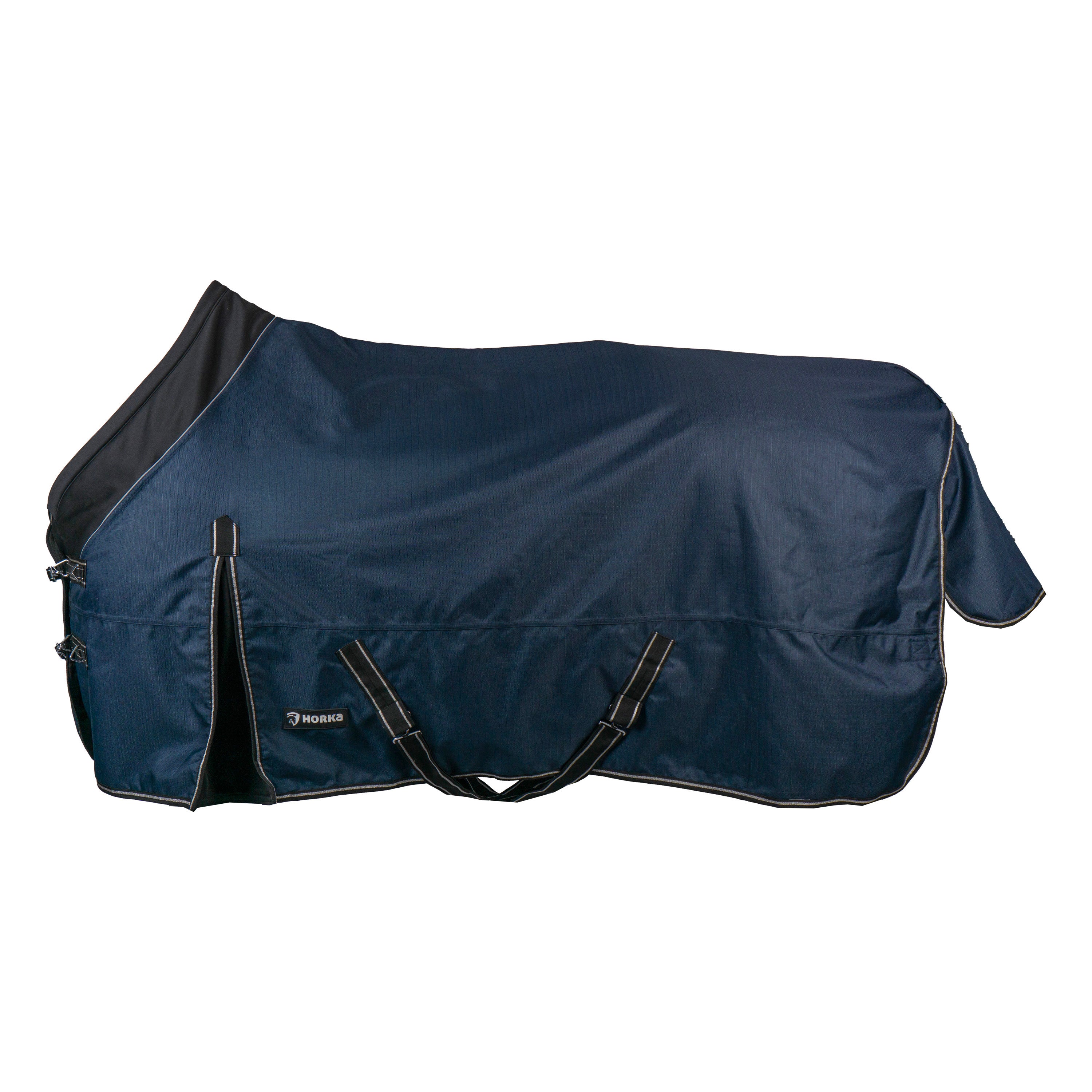 Strapazierfähige Outdoordecke mit weich gepolstertem Softshellkragen für extra Komfort. Ausgestattet mit einem 100-Gramm-Widerristschutz, doppeltem Brustverschluss, Kreuzbegurtung und abnehmbaren Beinschnüren. Produktspezifikationen: <1200D Ripstop-Polyester, 3000 mm wasserdicht und 3000 mvp atmungsaktiv, 100-Gramm-Füllung, Polyesterfutter. Doppelt verstellbarer Brustverschluss mit Druckknopf und Klettverschluss. Kreuzbegurtung mit elastischen Enden und Gummistoppern. Elastische Schweifkordel mit PVC-Besatz und 2 Clips. Widerristschutz: