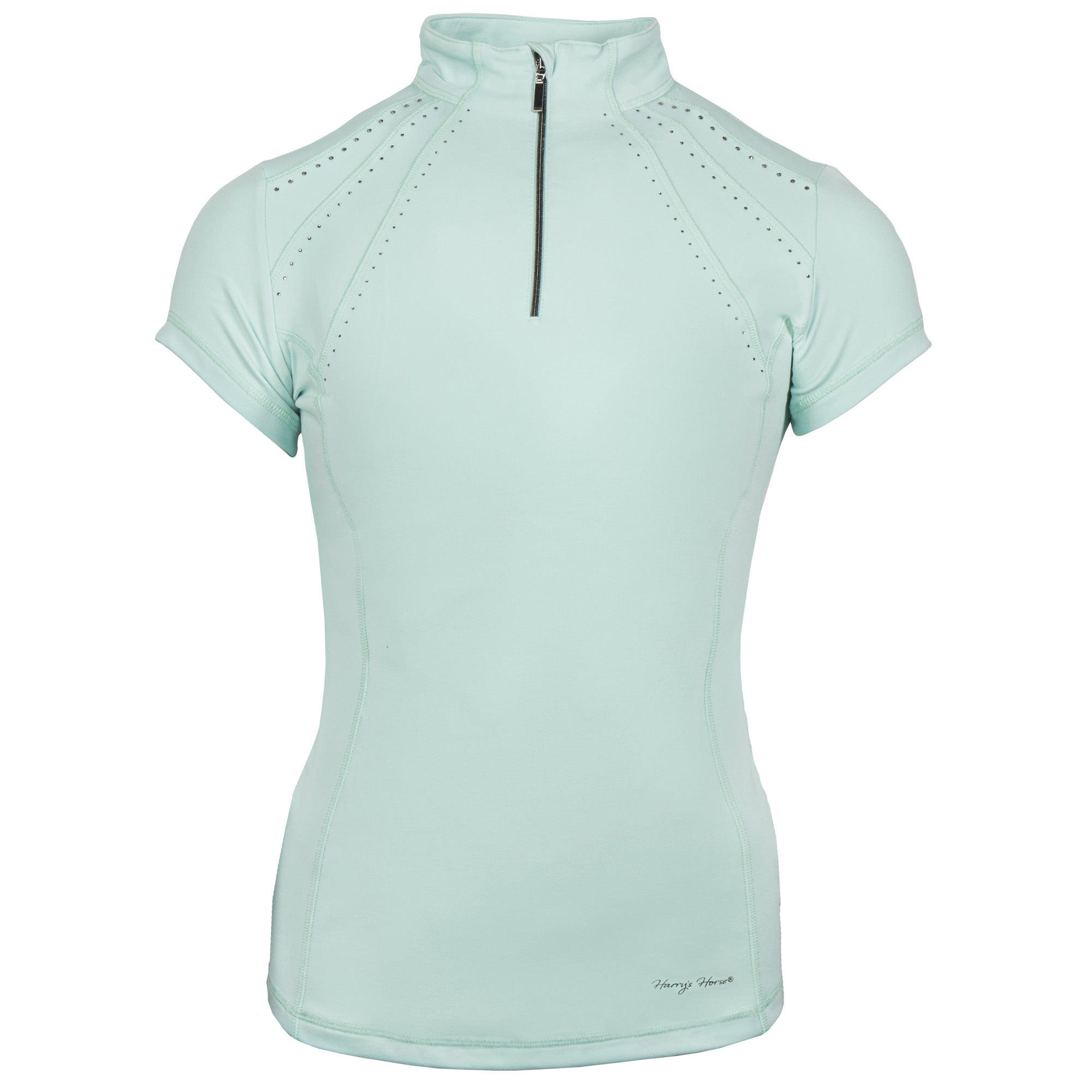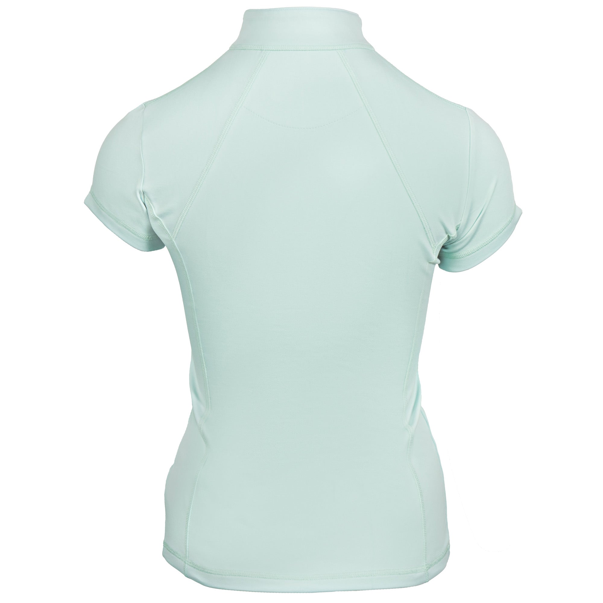 Dieses elegante Kurzarmhemd mit Stehkragen und kurzem, anthrazitfarbenem Reißverschluss verleiht jedem Reiter einen modernen, sportlichen Look. Brust und Schultern sind mit Ziernähten und drei Reihen funkelnder Kristalle verziert – ein dezenter Hauch von Glamour für jeden Reiter. Gefertigt aus einem geschmeidigen und dehnbaren Material, das für eine perfekte Passform und hohen Tragekomfort sorgt, ob im Sattel oder außerhalb.