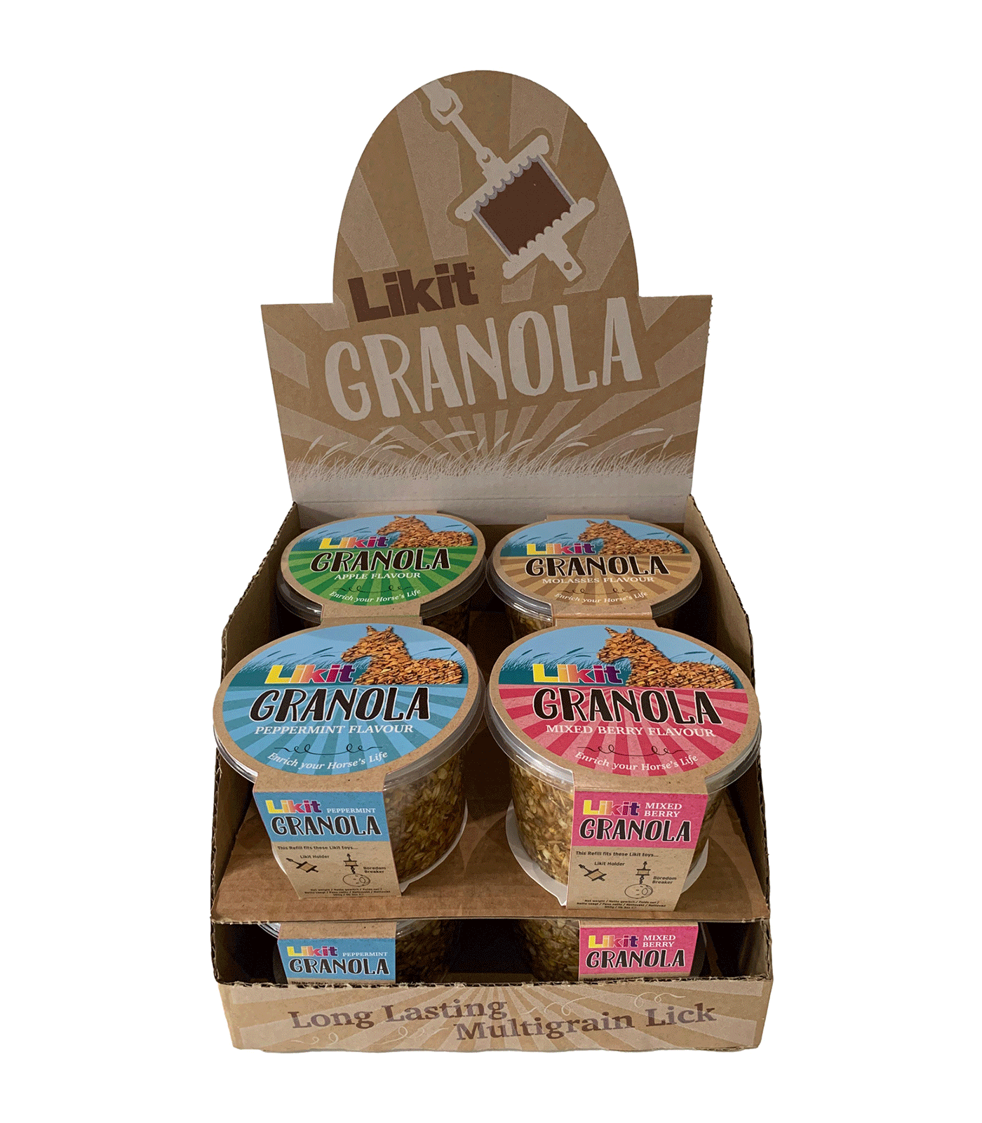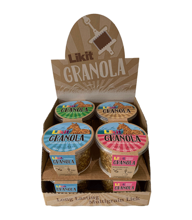 An extra long-lasting lick, packed full of delicious kernels, including: maize, wheat, barley and oats. Use it in your Likit holder or Boredom Breaker to relieve boredom and stress in horses or simply just as an entertainment for your horse or poney.