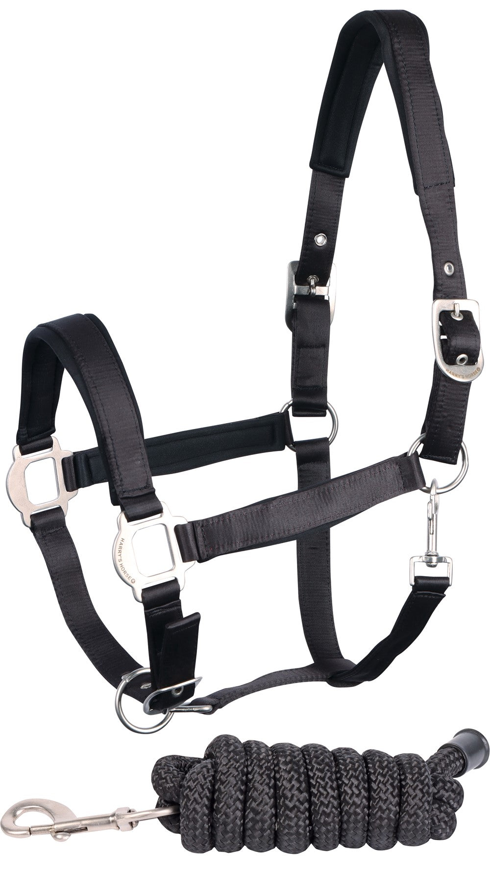 Halsterset bekleed met satijn en onderlegd met neopreen. Verstelbaar aan beide kanten van het kopstuk en aan de kaak. De gaatjes zijn voorzien van oogjes. Inclusief een halstertouw van 2 meter. Ideaal halster om te bedrukken voor bijvoorbeeld promotiedoeleinden of te personaliseren.