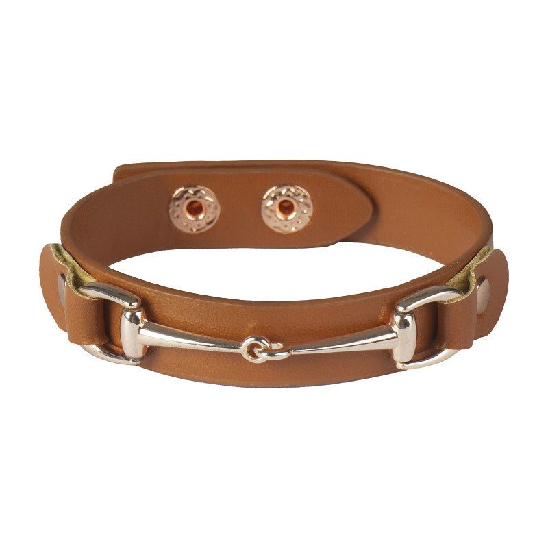 Armband van kunstleder afgewerkt met metalen bitje. Verstelbaar middels 2 drukknopen. Afmetingen: Kortste lengte: 17 cm Langste lengte: 20 cm Materiaal: Kunstleder en metaal