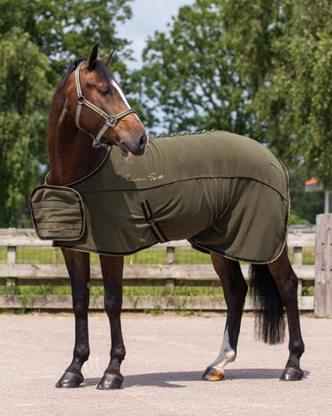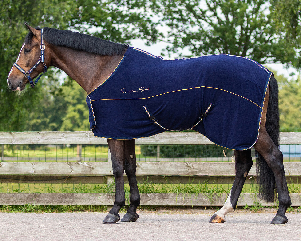 Dunne zomerdeken van microvezelstof die ideaal te gebruiken is na het afspoelen of wassen van het paard. De stof neemt water snel op waardoor het paard snel droogt. De gouden 'Equestrian Sports' print en de verwijderbare flap die de voorsluitingen bedekt geven de deken een elegante look.