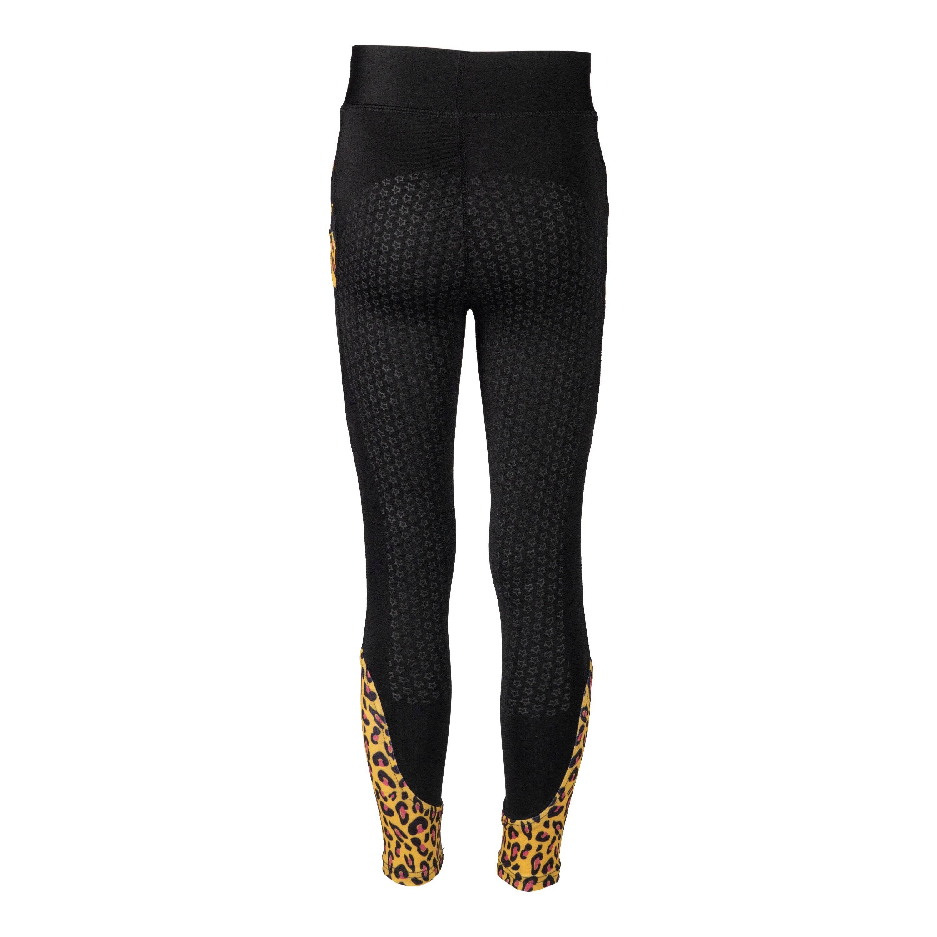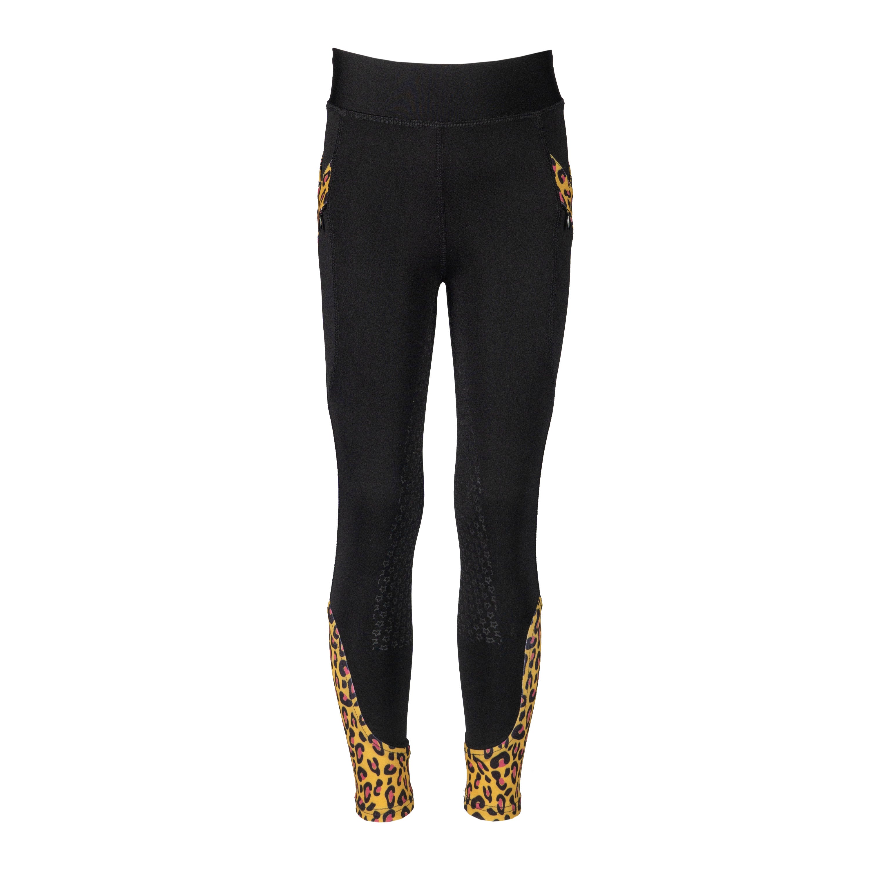 Junior rijlegging met luipaard print op enkels en broekzakken. De Kylie beschikt over twee zakken met rits en een mat siliconen full seat zitvlak. Productspecificaties:< Junior rijbroek Twee zakken met rits diep genoeg voor mobiele telefoon Luipaard print elasta enkelsokken Details met luipaardprint rond de broekzakken Mat bedrukte Silicone Full Seat Materiaal:< 93% polyester 7% Elastaan geweven