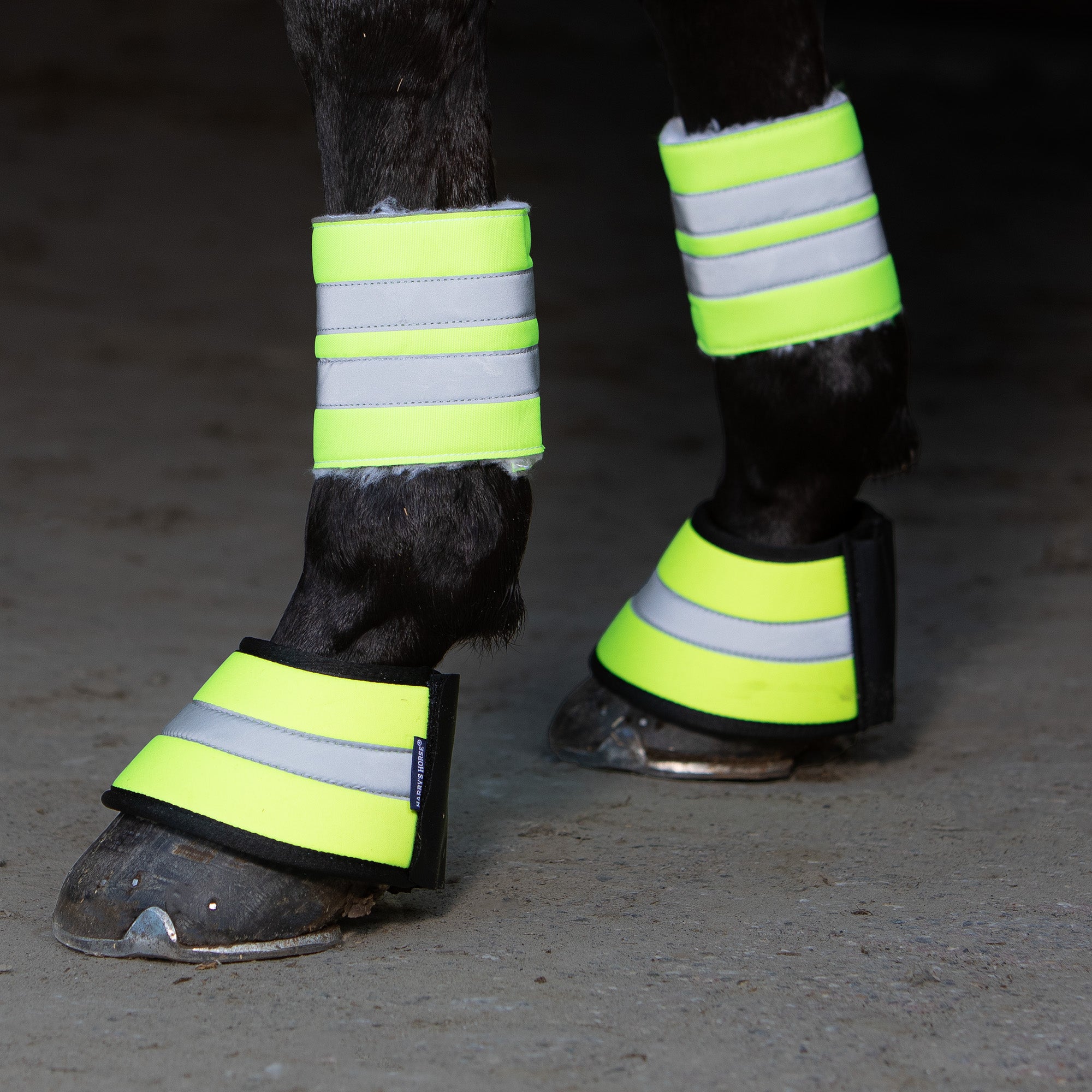 Springschoenen in fluoriserend gele stof met reflectie streep erop om je paard beter zichtbaar te maken in het donker.