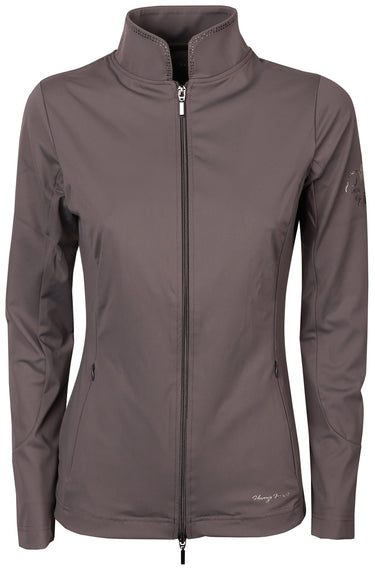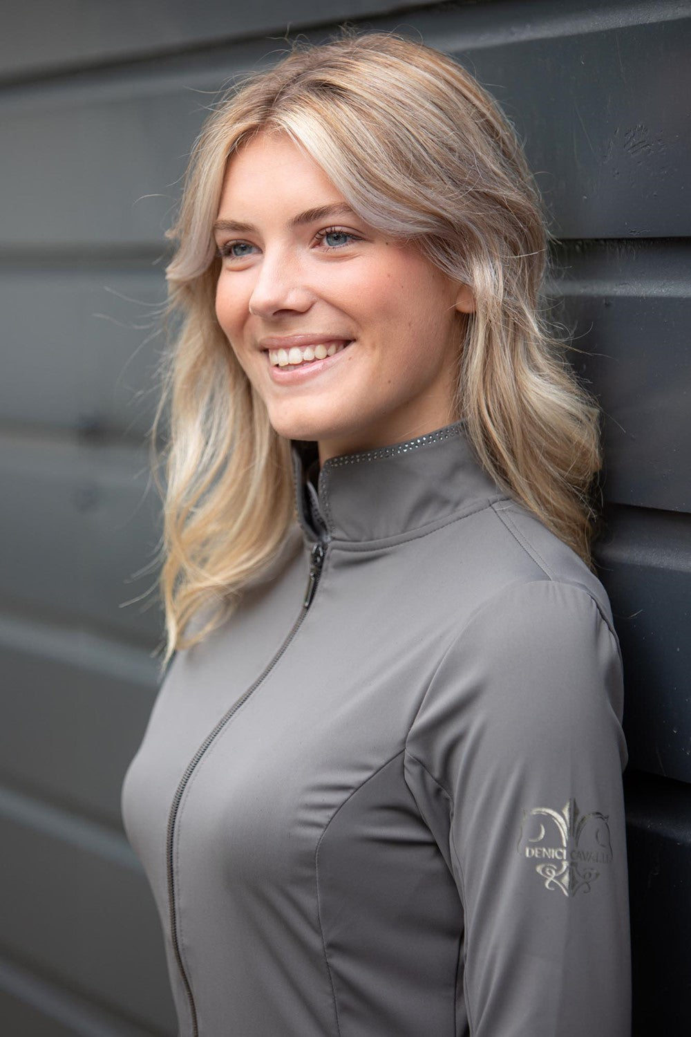 Vest met opstaande kraag gedecoreerd met een dubbele rij kristallen, een tweeweg ritssluiting, twee steekzakken met ritssluiting en het Denici Cavalli logo op de linkermouw.